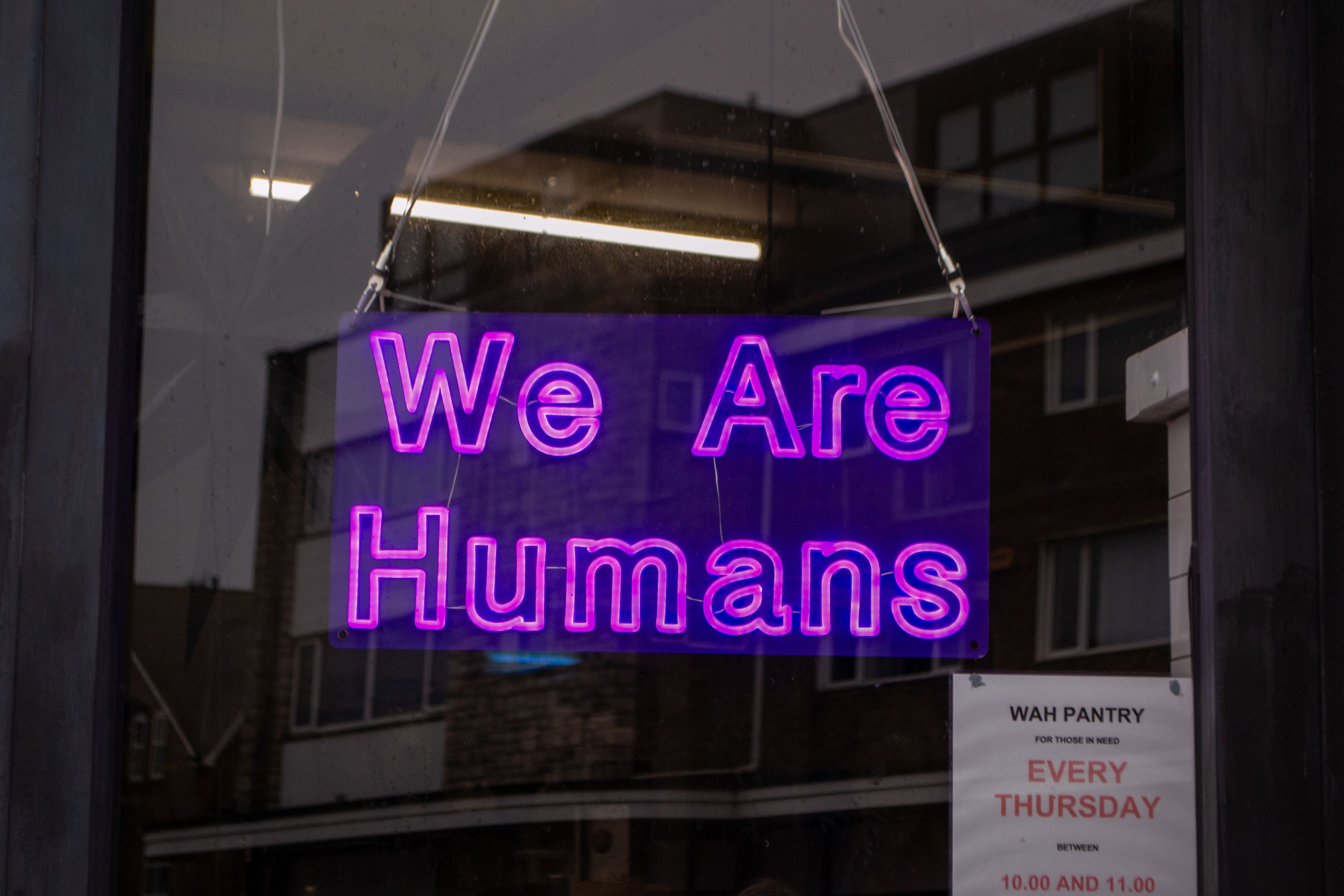 We Are Humans light-up sign outside their base. Image Credit: Darcy Miller