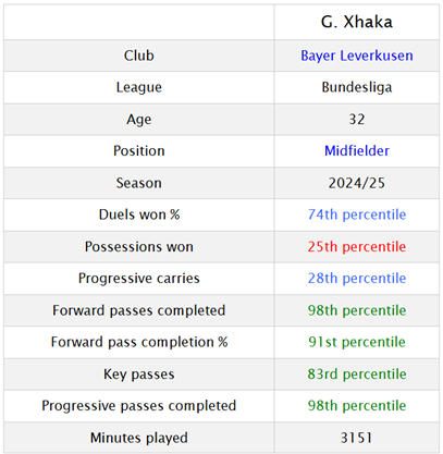 Last season, in the Bundesliga, only two players played more progressive passes than Xhaka (203), and only eight players registered more assists in open play (seven).
