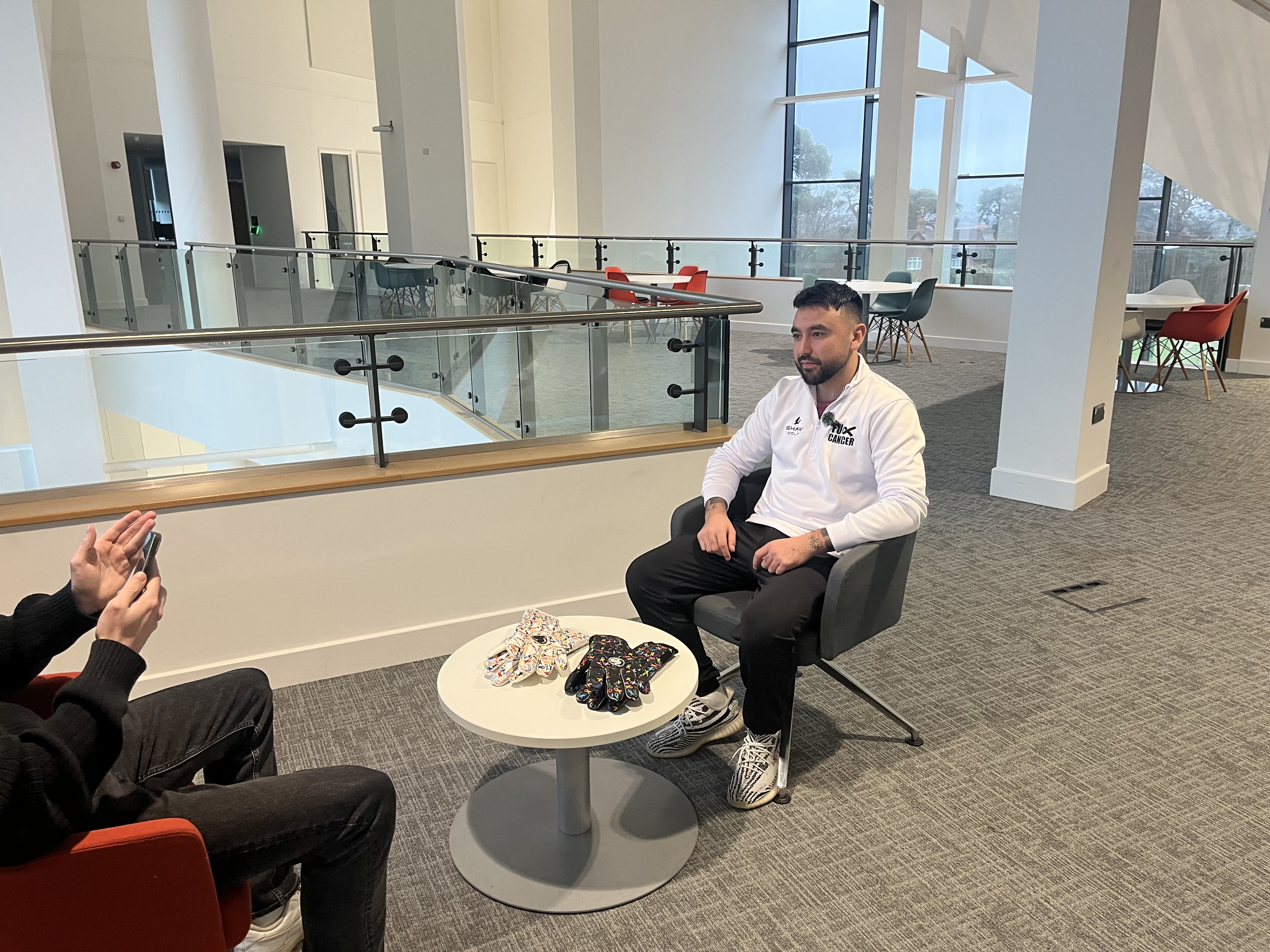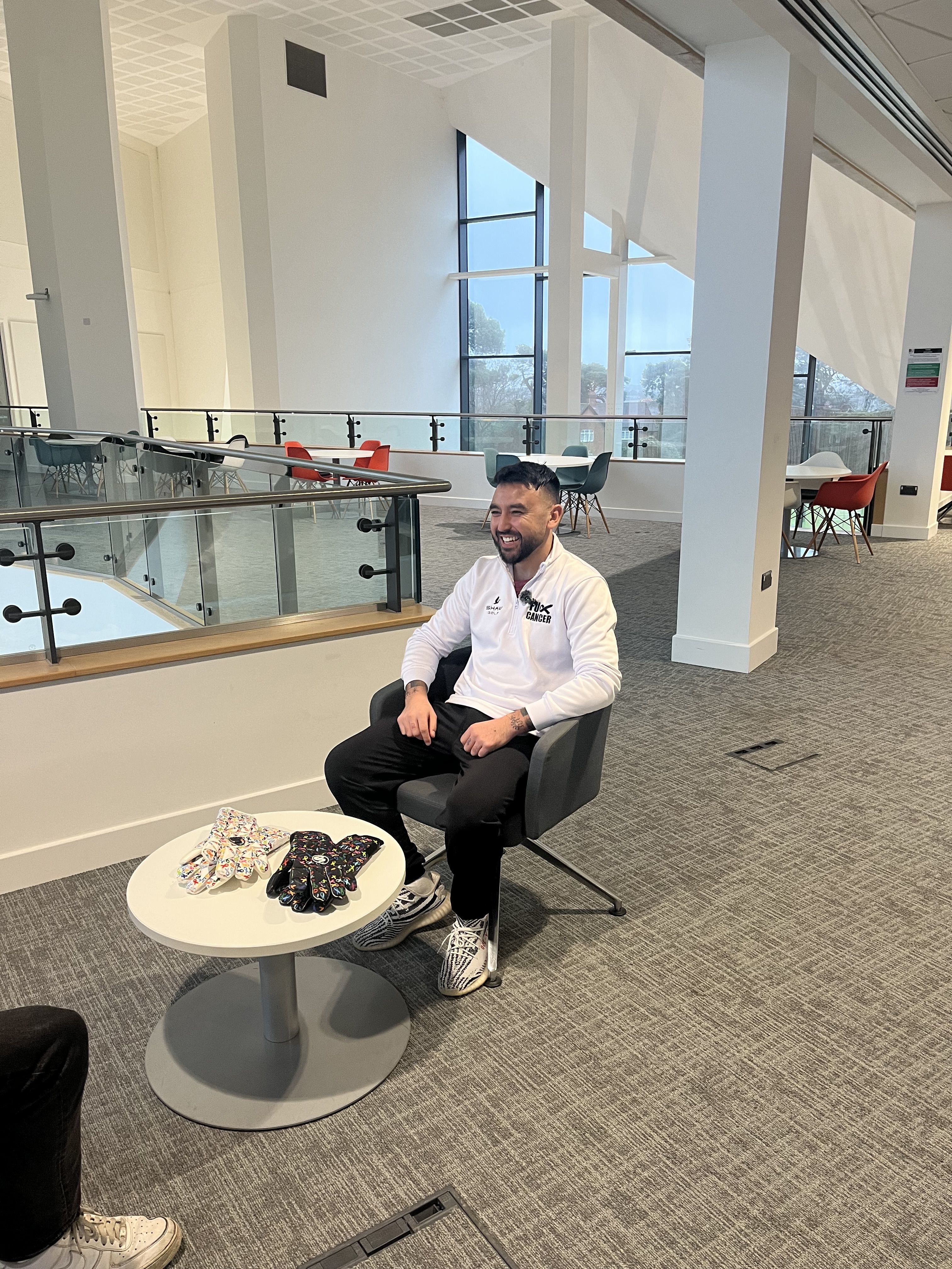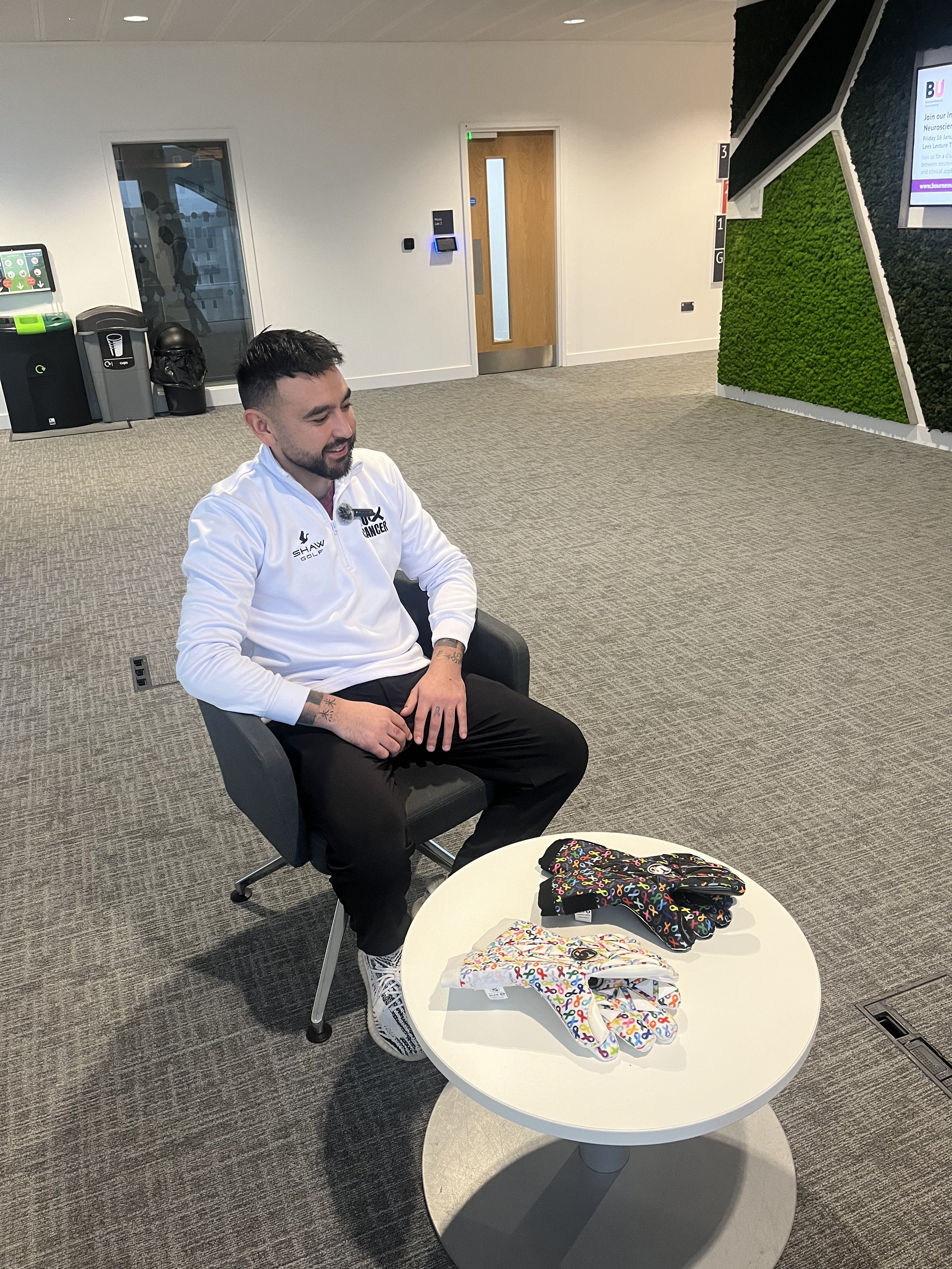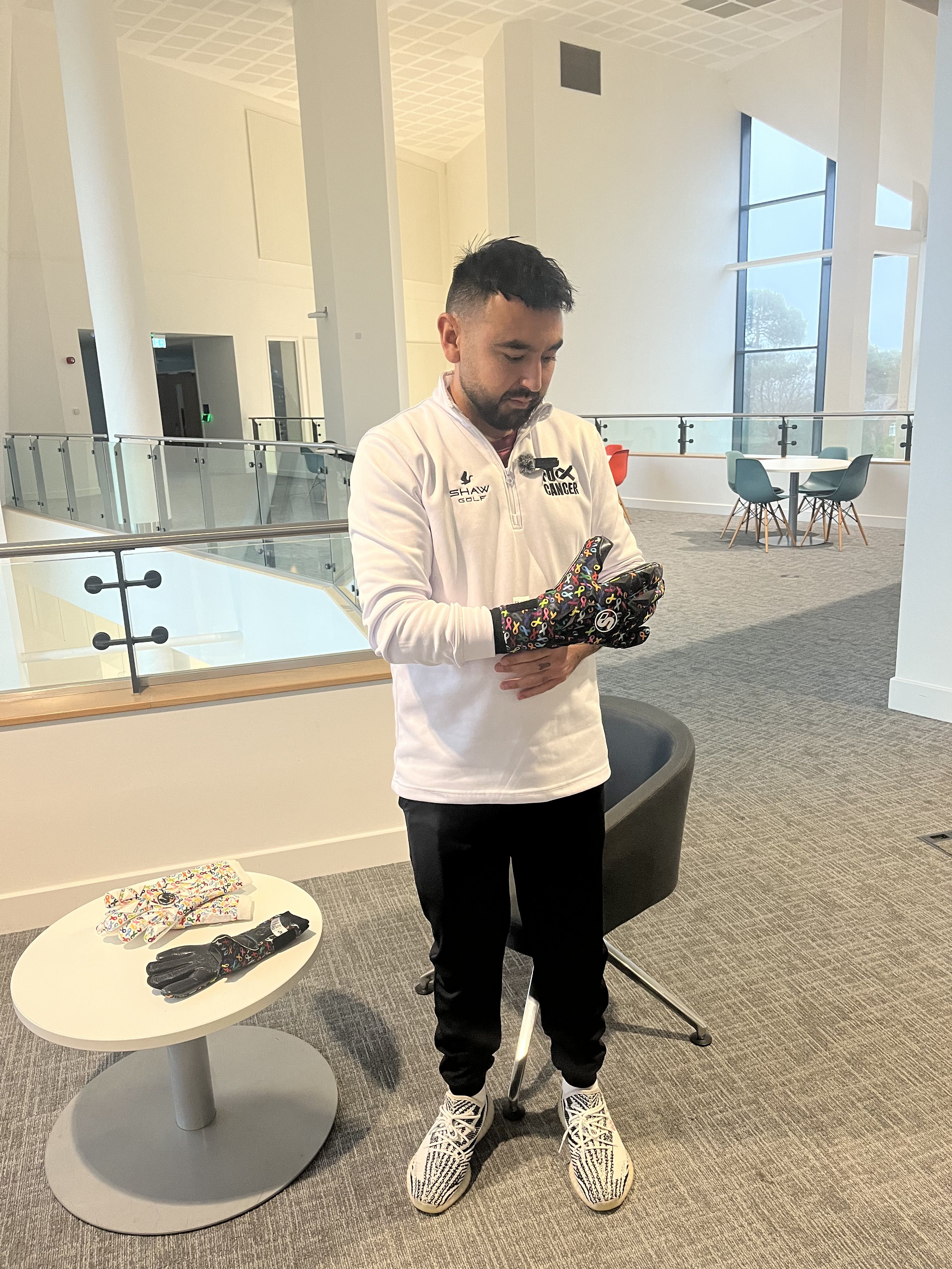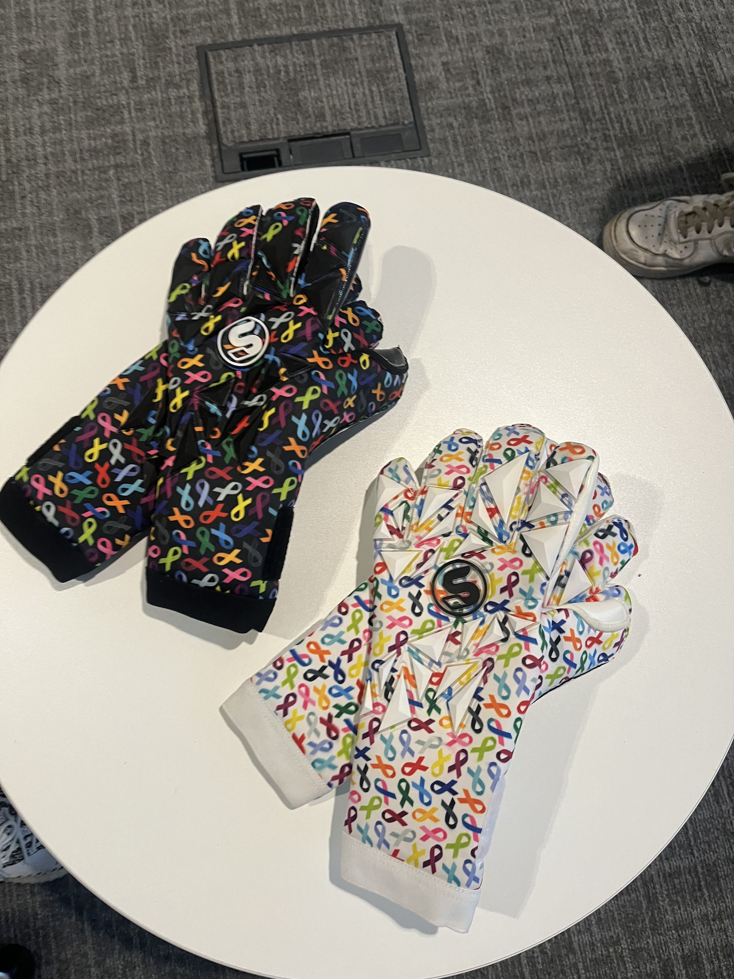 The design on the gloves are chosen to made awareness for cancer - the chosen partner charity, Macmillan Local, is where Ben was in the unit during treatment.