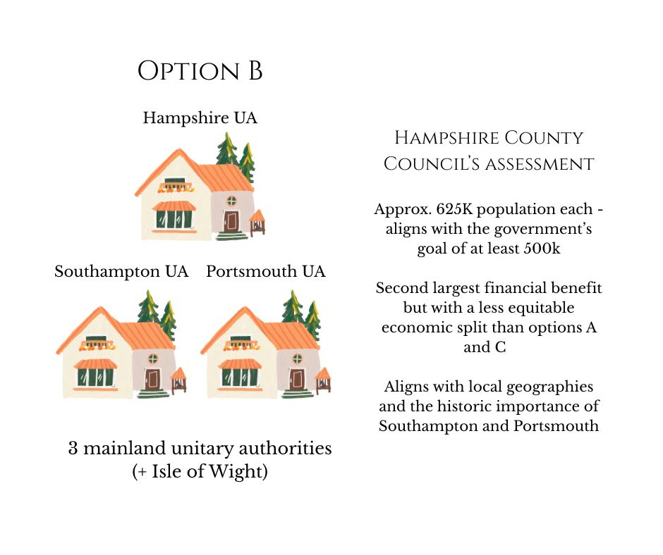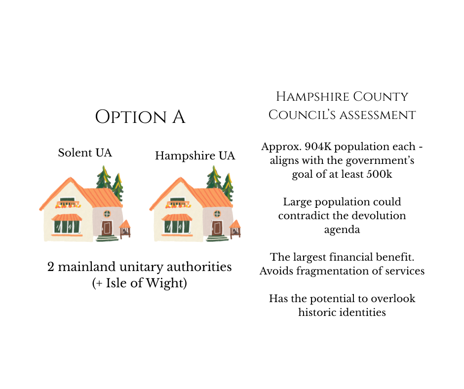 The first decision in the process of LGR must be how many authorities will be created, and where the boundaries will be. In their joint proposal, Hampshire County Council set out three options: 2, 3, or 4 mainland UAs. When taking into consideration the transition costs, service fragmentation, local identities and, most importantly, any efficiency savings, the County appear to have concluded that 2 mainland UAs is the best option. A conclusion not shared by other councils in Hampshire.
