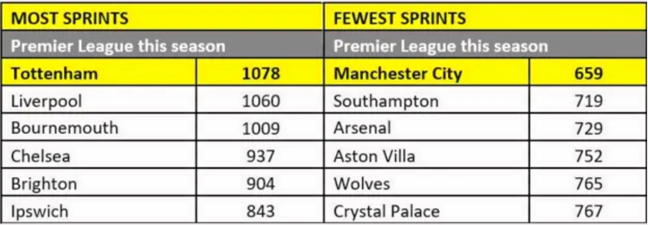 BBC reported a statistic in early October which showed that Southampton were second bottom in the table when looking at sprints only ahead of Manchester City who tend to create chances through slow build up play.
