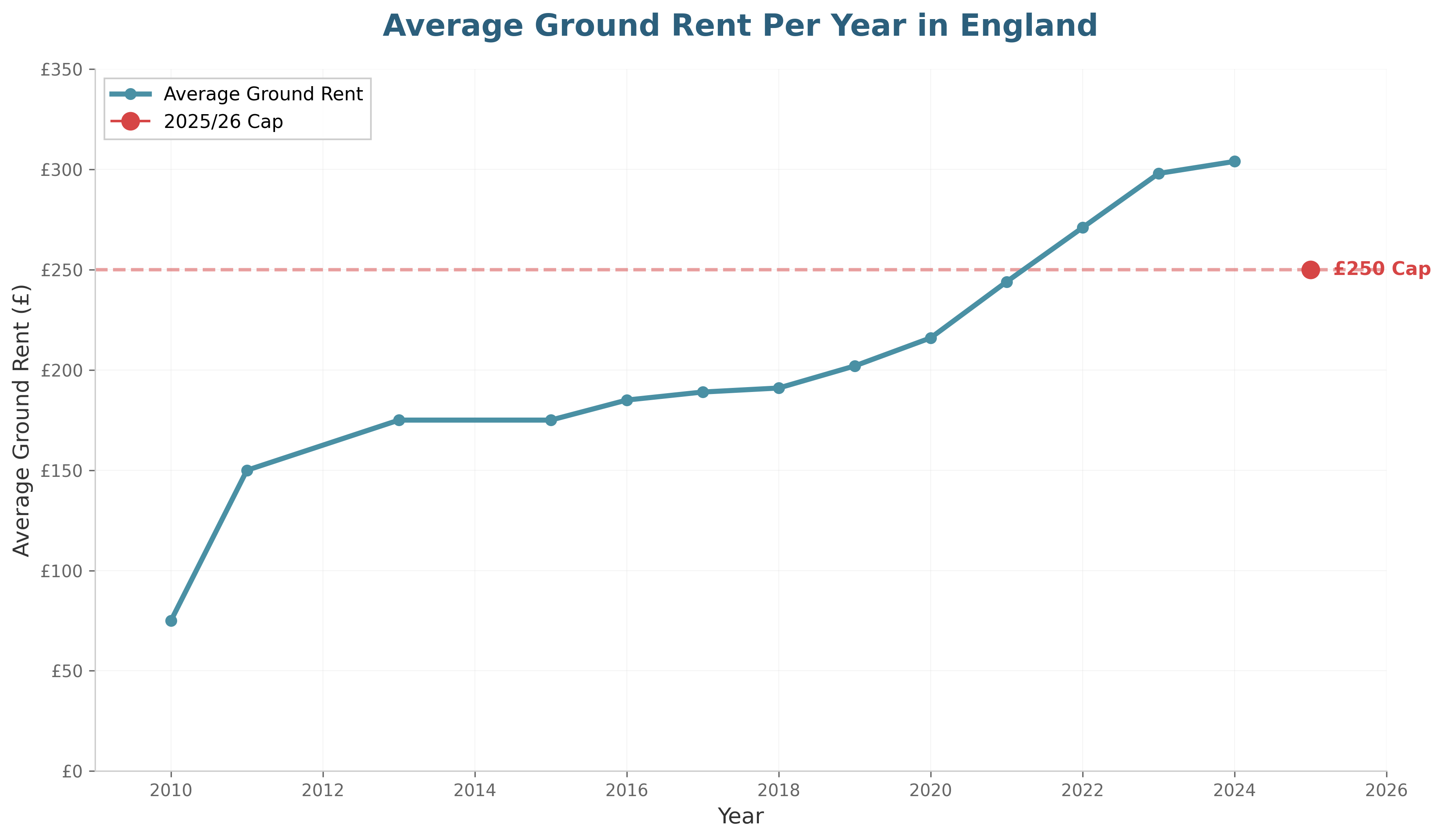 Mean annual costs for leaseholders have risen significantly as modern leases replaced traditional nominal 'peppercorn' agreements. While the 2022 Act abolished ground rent for new leases, existing legacy contracts continue to see increases, prompting the 2026 legislative cap of £250 | Source: Ministry of Housing, Communities & Local Government (MHCLG); English Housing Survey (EHS) Live Table FT2233; and the House of Commons Library Research Briefing on Leasehold Statistics (2025/26)