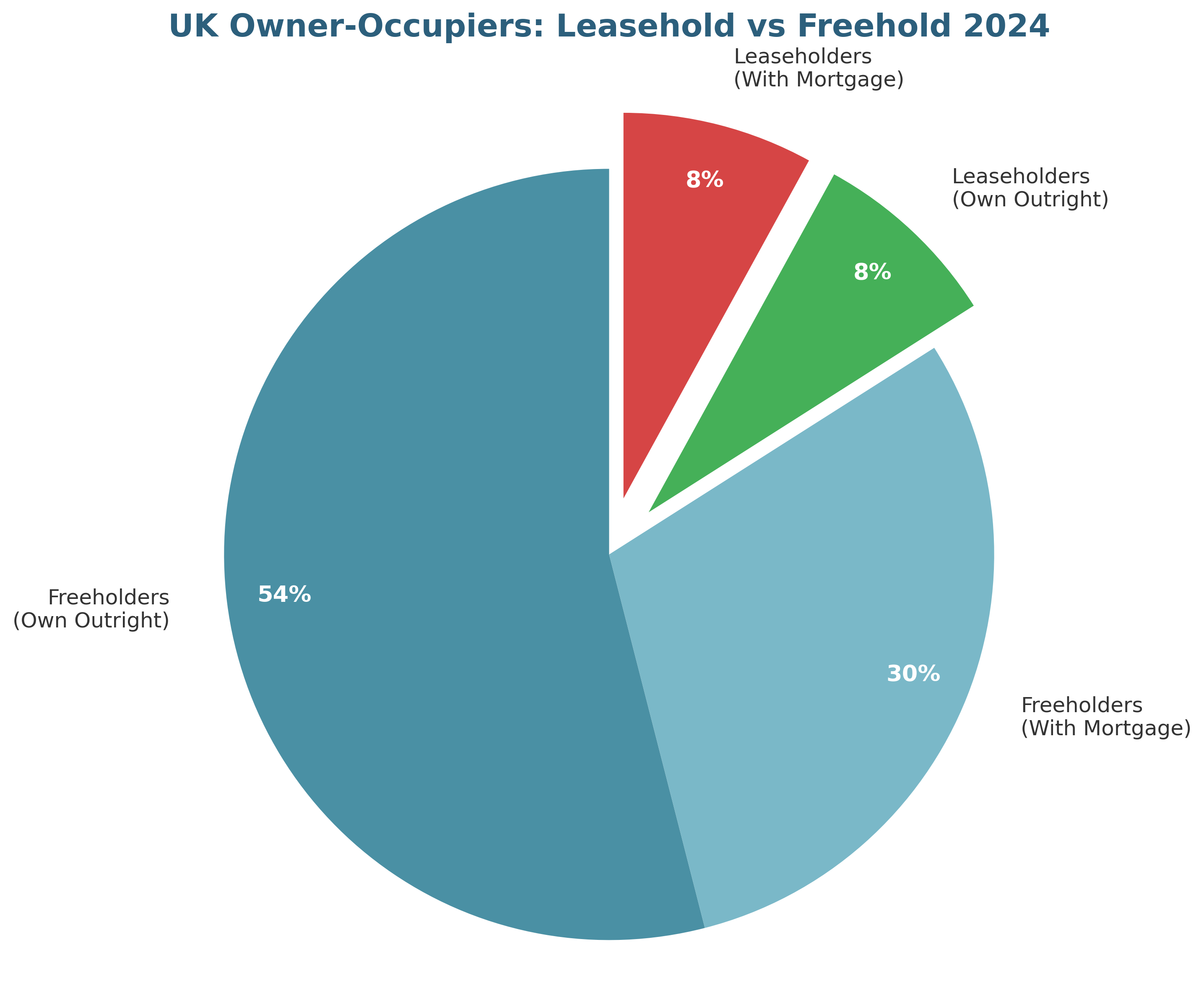 Owner-occupiers in England by tenure and legal status. While 65% of households own their homes, approximately 1 in 6 homeowners are leaseholders | Source: Ministry of Housing, Communities & Local Government (MHCLG), Leasehold Dwellings England 2023-24/2024-25, and the English Housing Survey.
