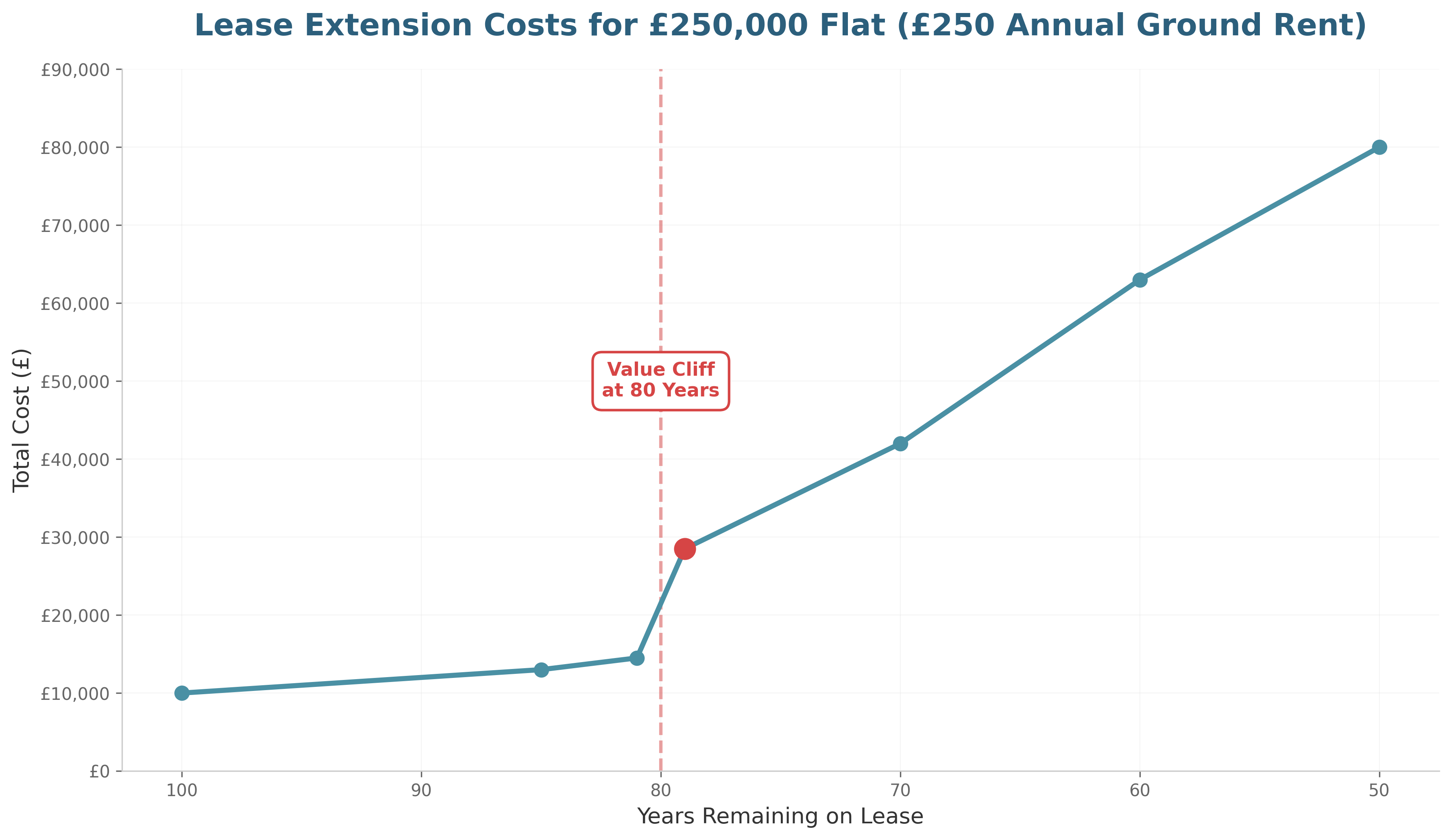 The 80-year "cliff edge" is the most expensive turning point for any leaseholder. Once a lease drops to 79 years, the law currently triggers Marriage Value, requiring the owner to share 50% of the property's potential value increase with the freeholder. For a typical £250,000 flat, this can instantly add over £14,000 to the cost of an extension. | Sources: Leasehold Reform, Housing and Urban Development Act 1993, The Leasehold Advisory Service (LEASE), Homehold (2026),