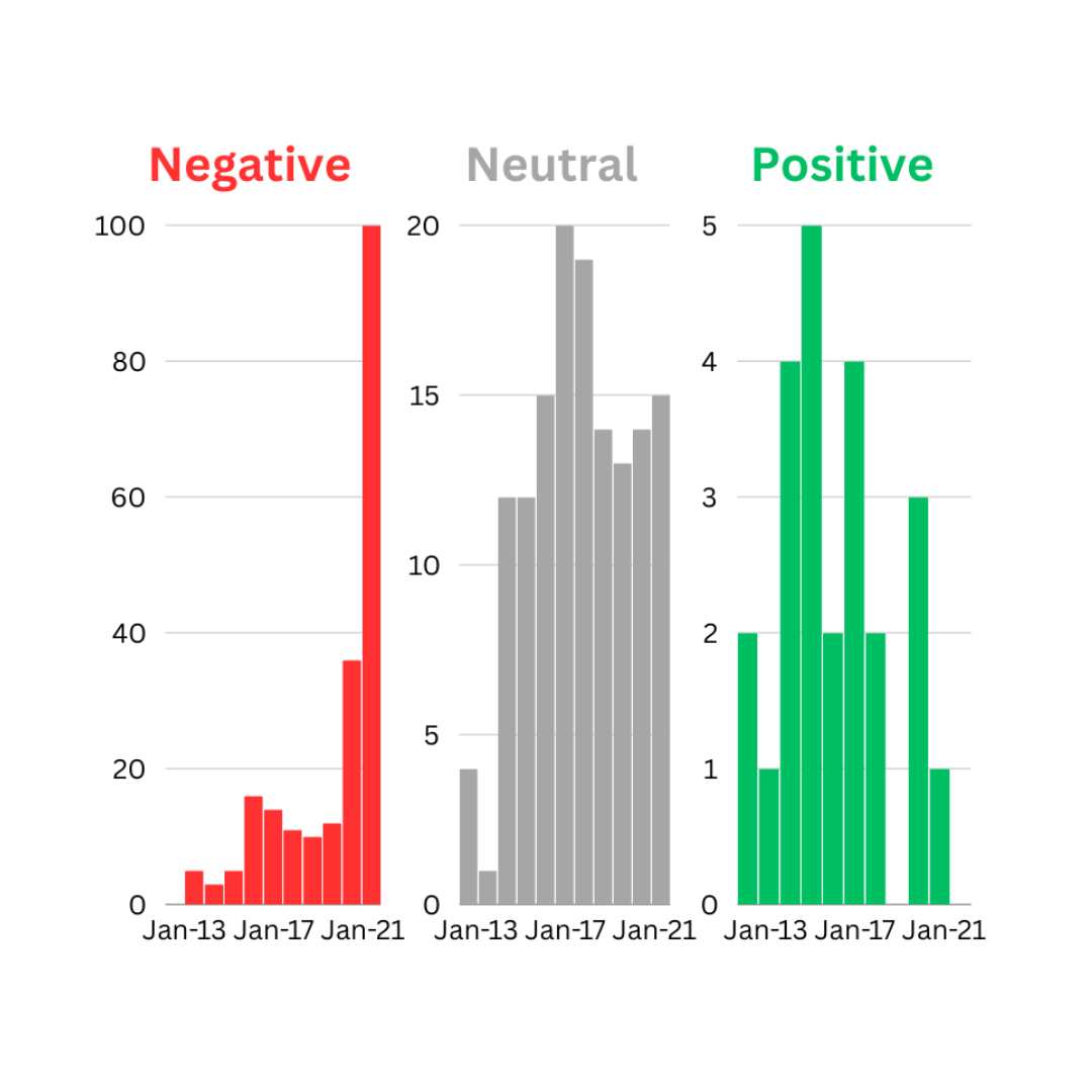 Mail articles on trans issues from 2013 - 2021 (categorised) bar chart photo by Aaron Sugg
